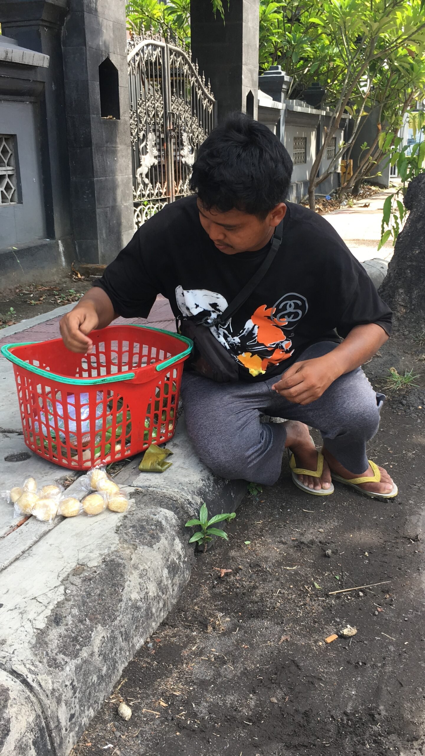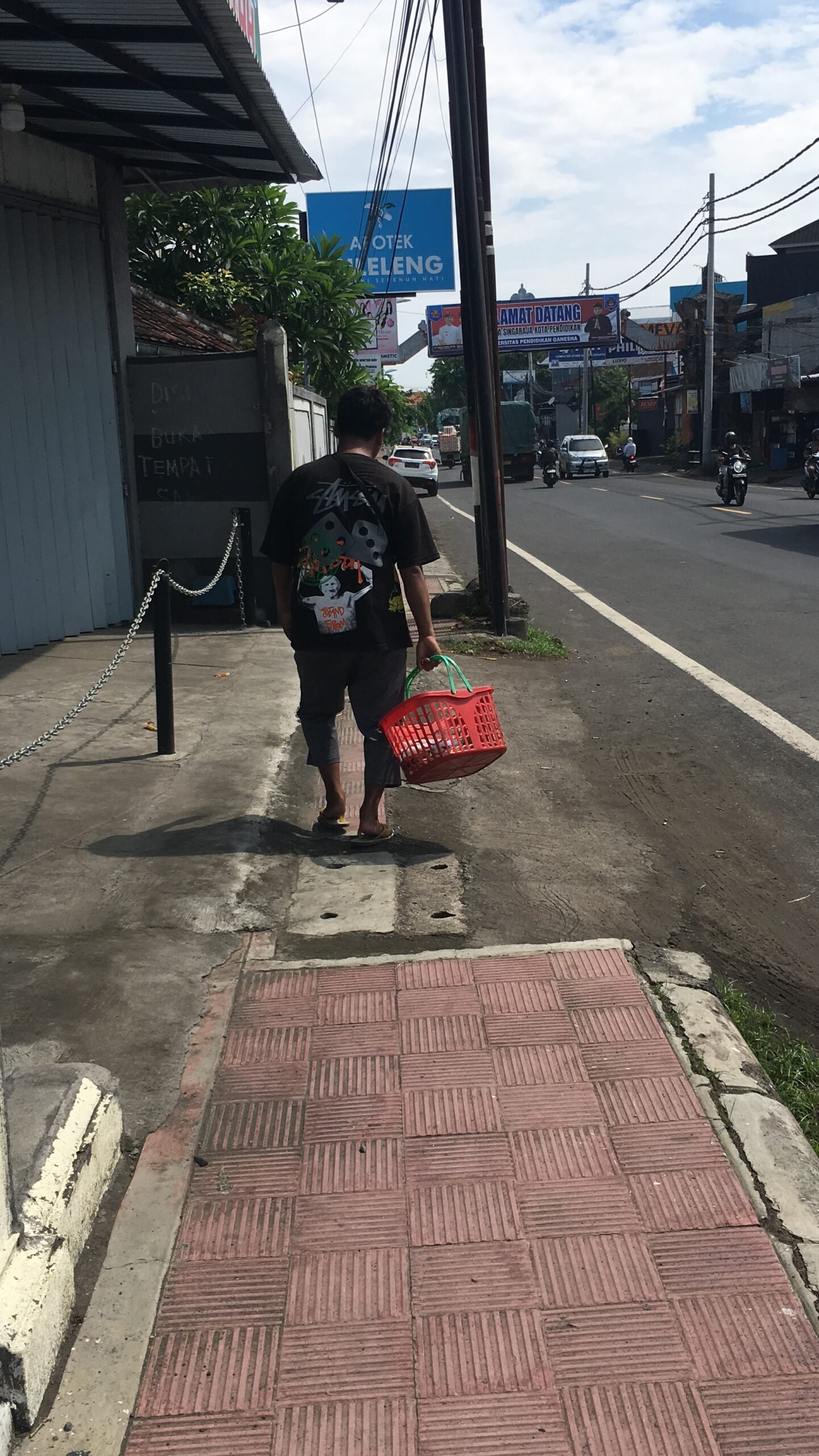 Setiap pagi, Muhammad Husein memanggul keranjang berisi jajanan basah dan gorengan. Dengan langkah pincang akibat polio sejak kecil, ia berjalan kaki menyusuri jalanan Buleleng, menembus panas dan hujan, menawarkan dagangan sambil bersuara lirih,