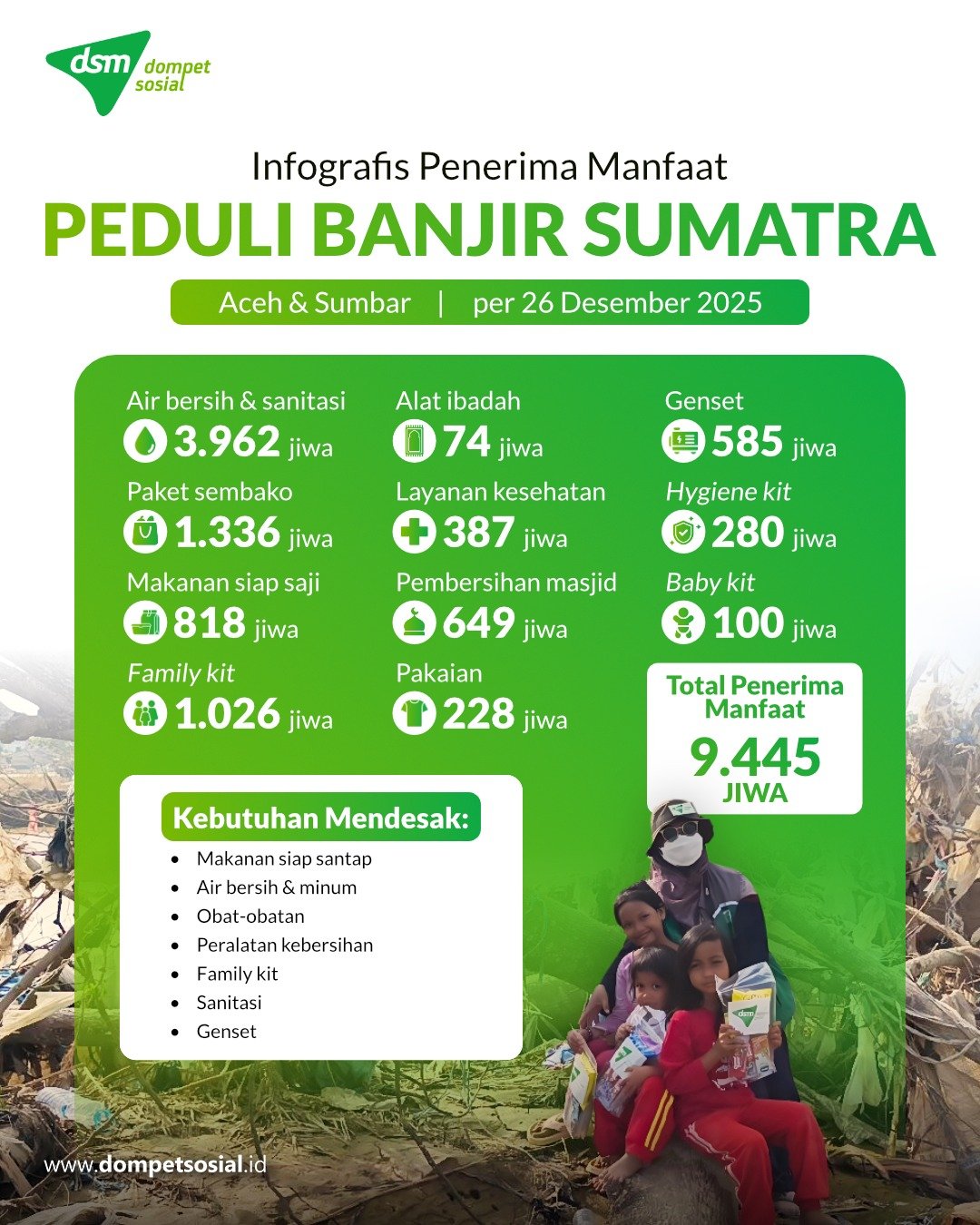 Sobat Baik, Alhamdulillah Tim DSM telah menyalurkan amanah dari Sobat Baik untuk saudara-saudara kita yang terkena musibah banjir bandang di Aceh. Adapun bantuan yang Tim DSM salurkan berupa tikar, kasur, makanan ringan, makanan siap saji, peralatan ibadah, air bersih, genset, hygiene kit, baby kit, layanan kesehatan gratis, serta kegiatan pembersihan masjid.